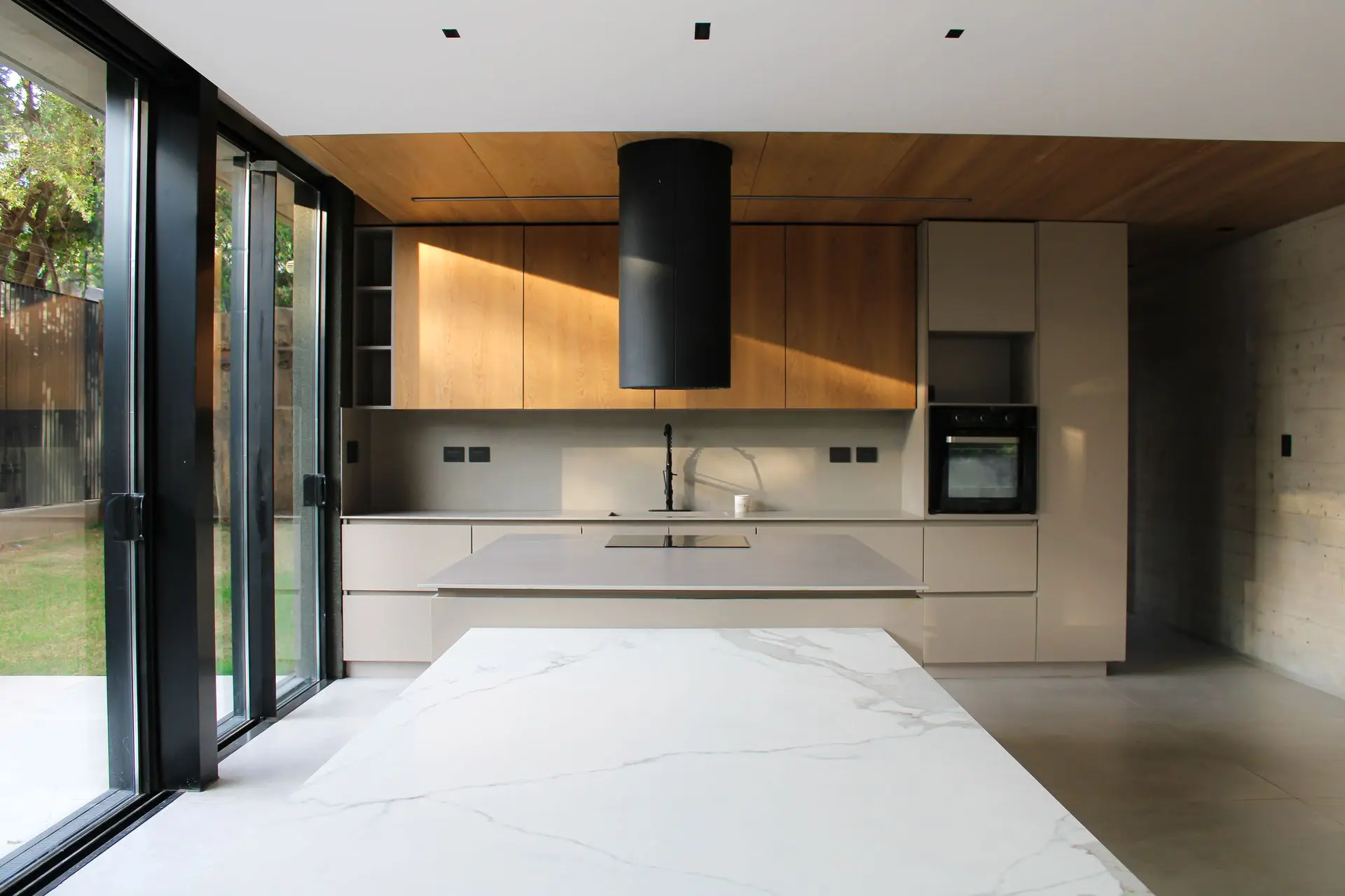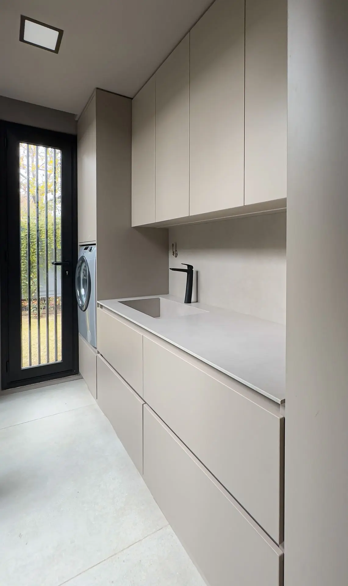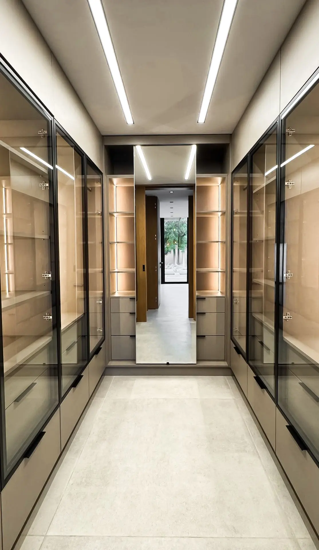Sin tener protagonismo todos los herrajes fueron de primera calidad con cierre suave en todas las puertas y cajones. Se combino en algunos muebles puertas de aluminio negro con vidrio.