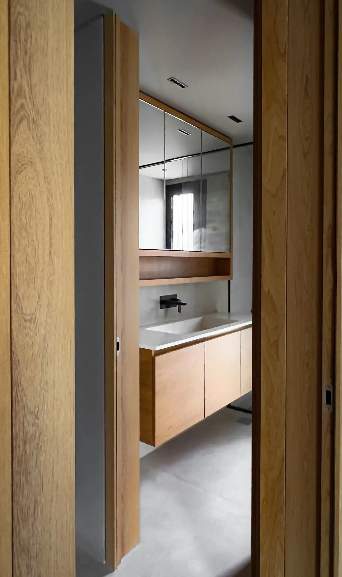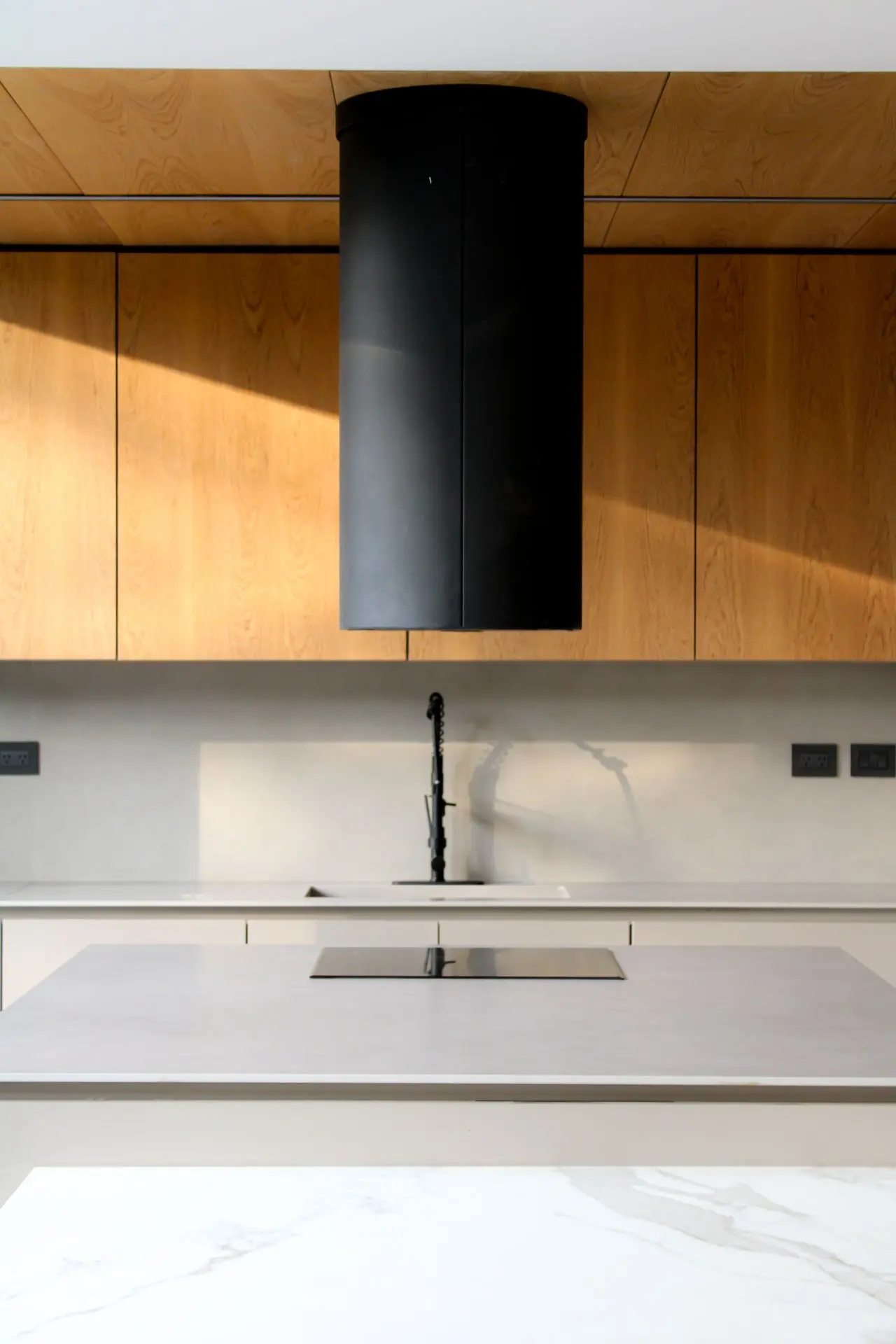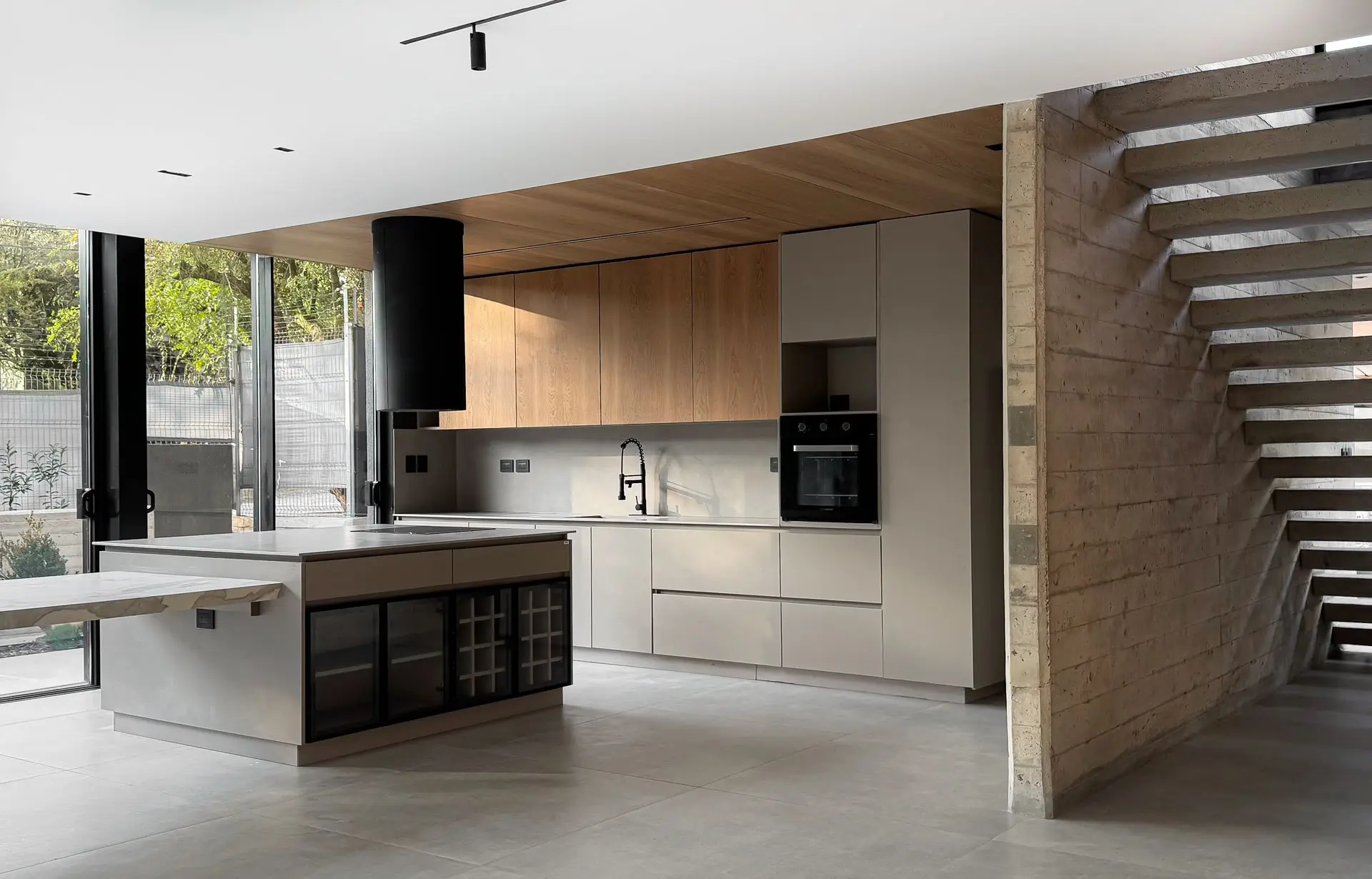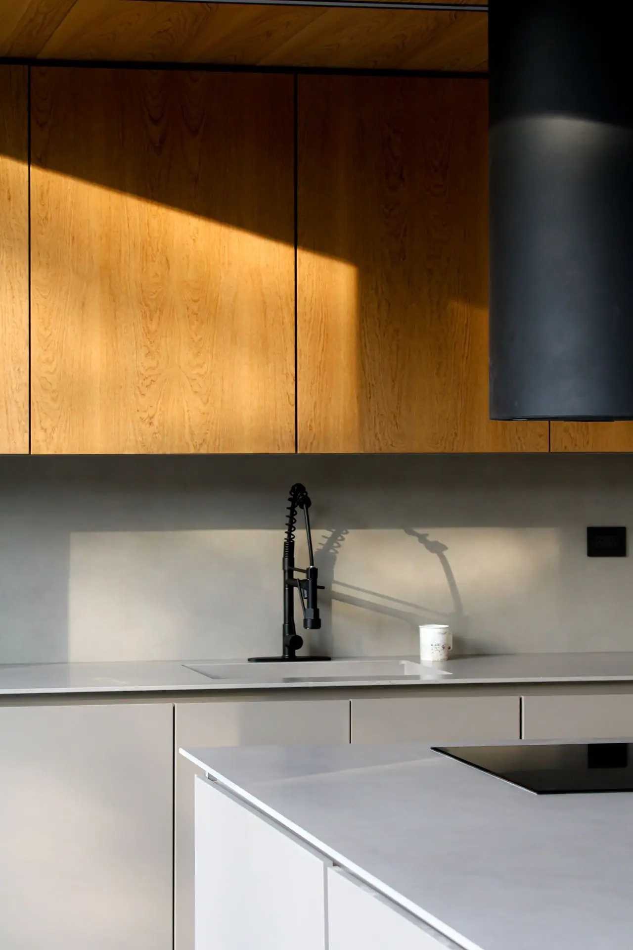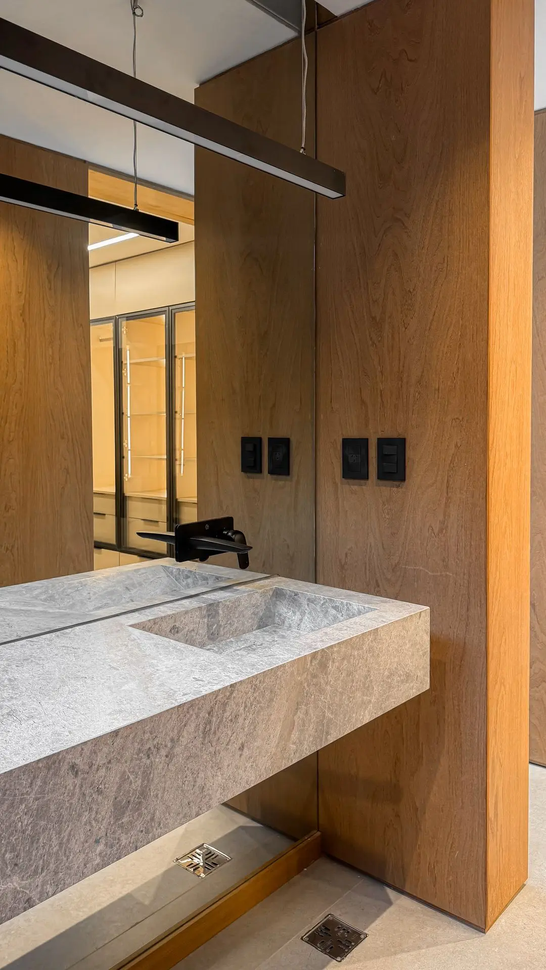 Los materiales utilizados fueron Gris Arcilla y Enchapado de madera natural de Goiabao Tostado, es un enchapado que se fabrica artesanalmente a pedido, el lustre fue extra-mate.